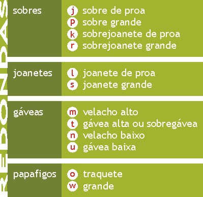Vinhateiras - São cabos fixos aos vergueiros das vergas com cerca de 0,5m de comprimento, com pinha de boça num dos chicotes, servindo para os marinheiros se agarrarem quando na manobra das velas.