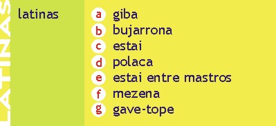 Adriças - São cabos de laborar que servem para içar ou arriar as velas; as velas latinas quadrangulares possuem duas adriças, uma da boca (que iça a boca da carangueja), outra do pique (serve para repicar a carangueja).